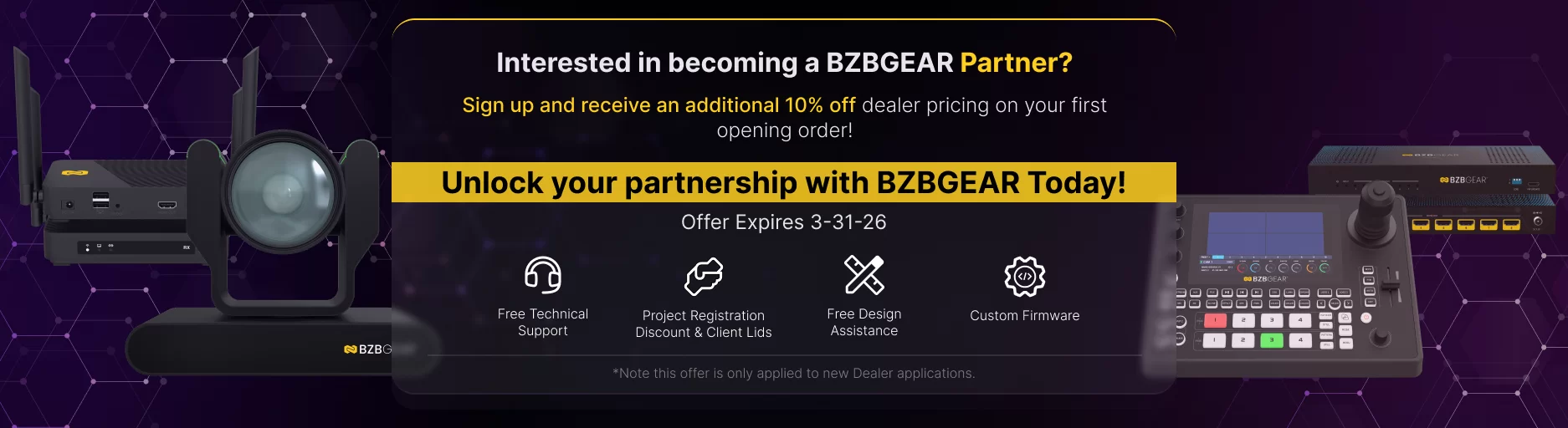 Join the BZBGEAR network as an authorized partner and unlock a world of opportunities to elevate your organization's growth and profitability. As a BZBGEAR dealer, you'll enjoy a host of exclusive benefits, including: