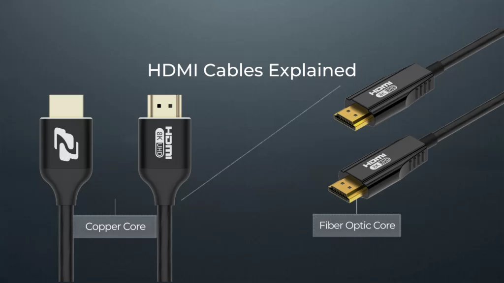 Active Optical Cables (AOCs) replace the copper signal conductors with optical fibers and tiny transceivers built into the connector heads. The HDMI ends still look the same, but inside the cable, your signal is light, not electricity.