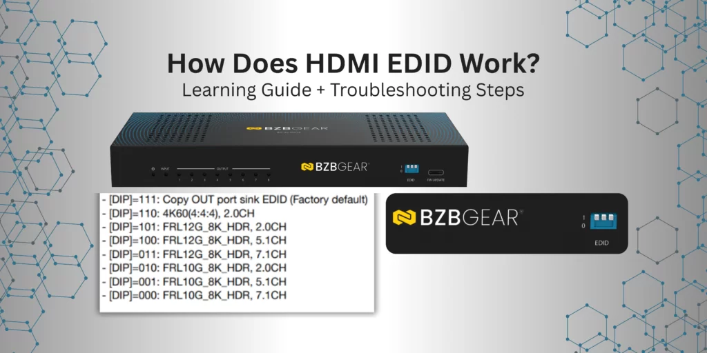 EDID stands for Extended Display Identification Data. It is a protocol that helps HDMI devices communicate more effectively by sharing information about the display’s capabilities. Instead of relying solely on automatic negotiation, EDID allows the source device to know exactly what video and audio formats the display supports. If EDID is an option, and there is a video or audio format issue, it is typically the first troubleshooting step recommended.