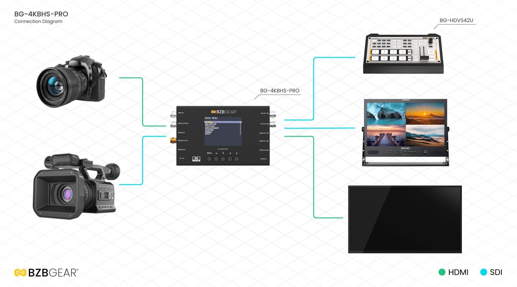- SDI LOOPOUT: Connect to a 12G/6G/3G/HD/SD-SDI display.