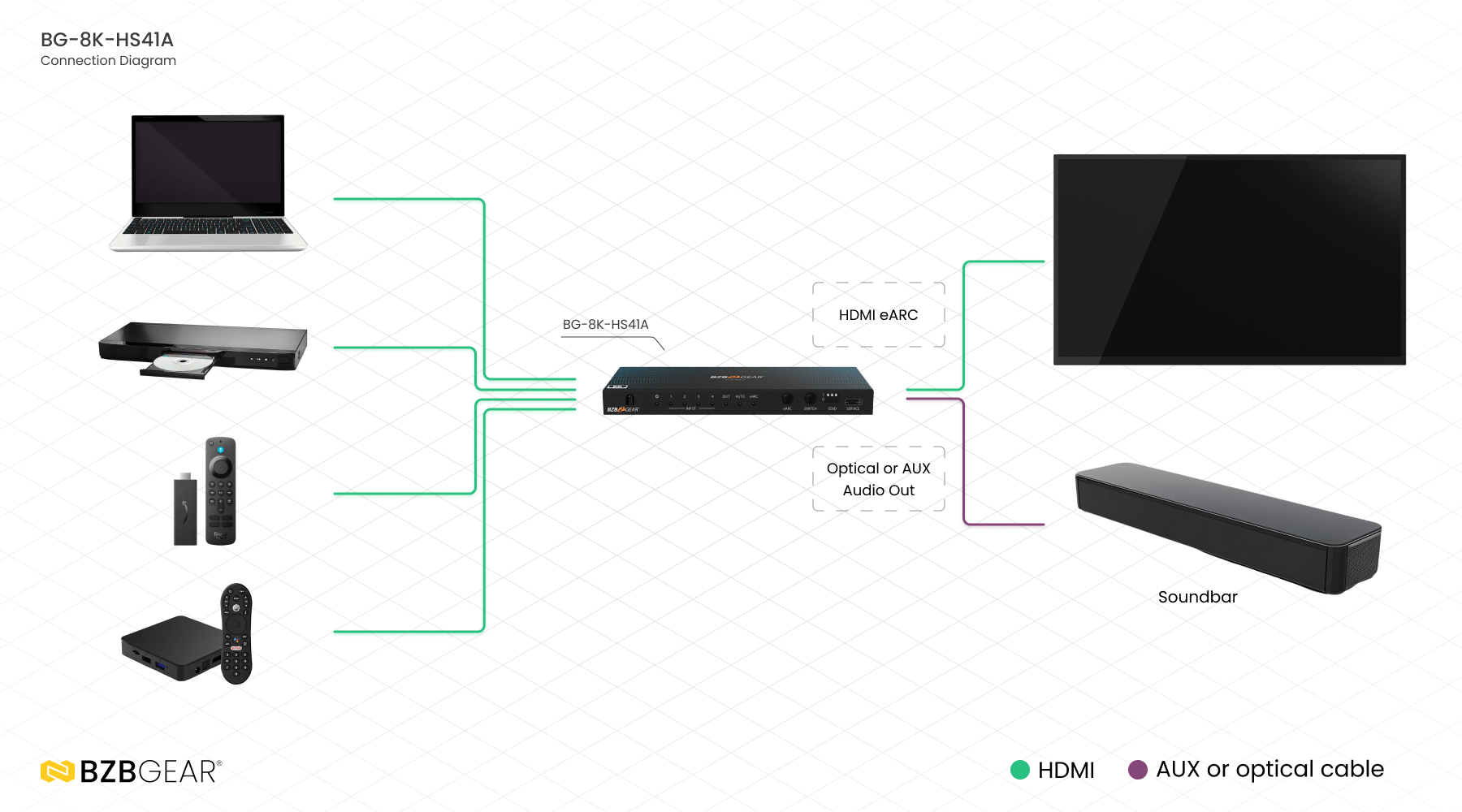 4x1 8K UHD HDMI 2.1 Switcher with Audio De-Embedding (8K60/4K120Hz 4:4:4 VRR/FVA/ALLM Support)
