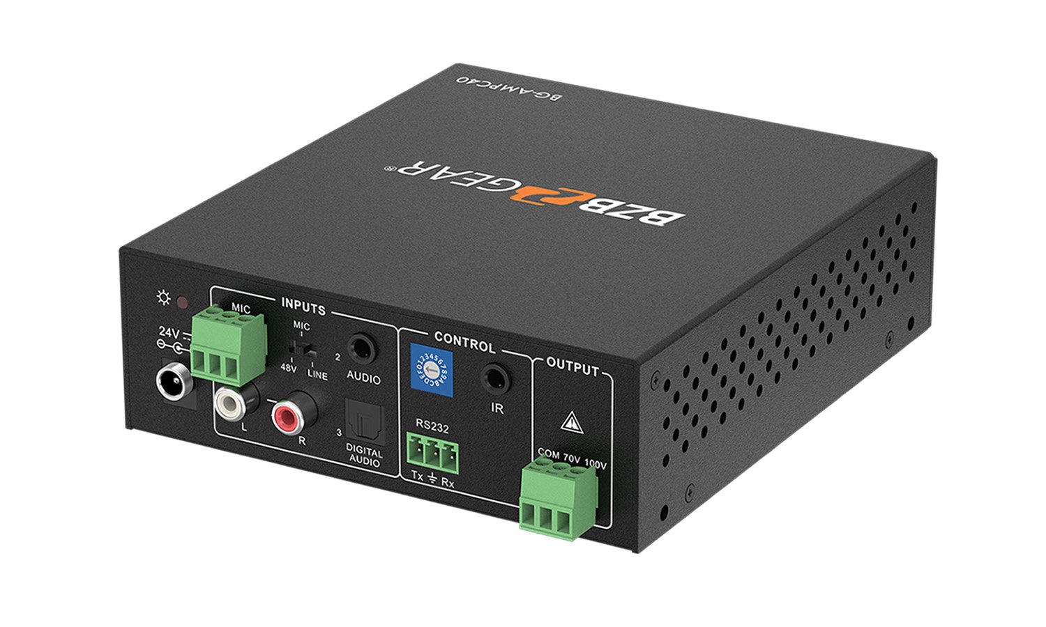 - Microphone input port: 3-pin phoenix connector for microphone input. The switch on the right side is used to select the input type: 48V (for condenser microphone), MIC (for dynamic microphone), and LINE (for line audio).