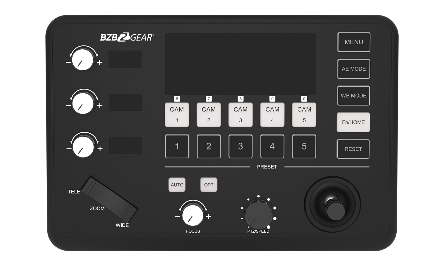 - 2-Axis Joystick: The joystick controls camera Up, Down, Left, and Right movement.