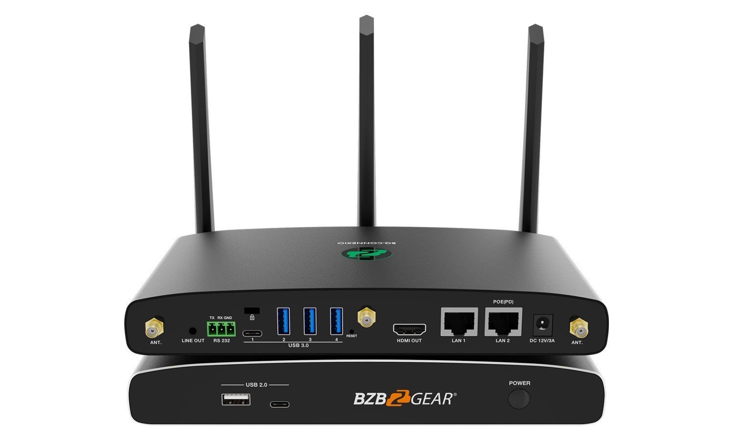 - Antenna fixture points: Screw in the three included antennas to these three ports.