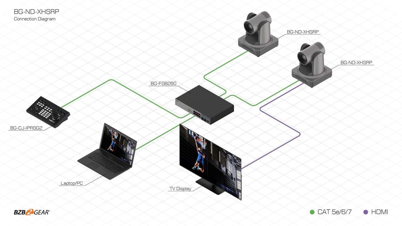 - NDI: Connect to a network switch via category cable to supply power (PoE), control (TCP/IP or webGUI) and stream (NDI|HX).