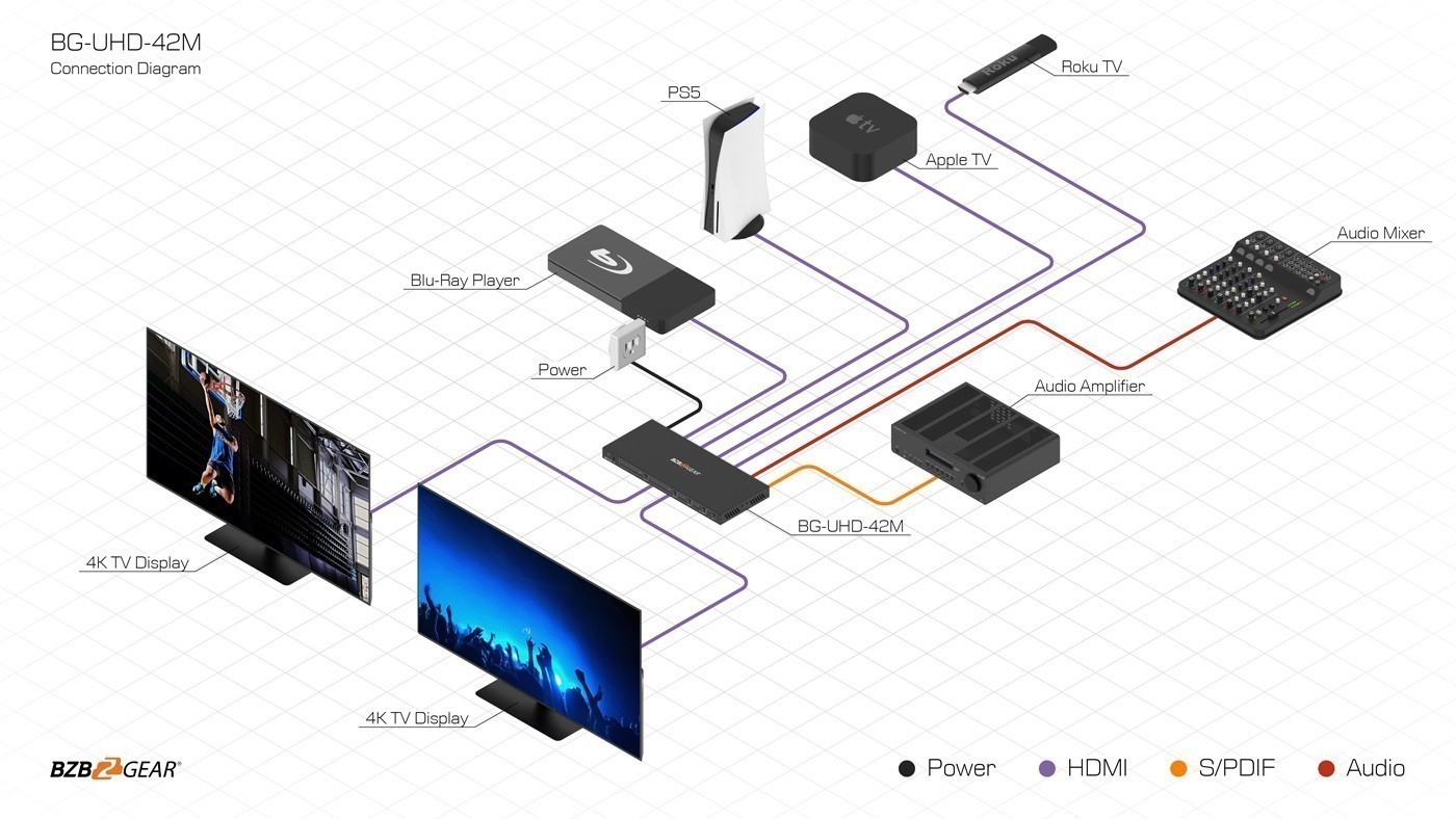 | Output Ports | 2×HDMI Type A [19-pin female] 1×L/R audio out [3.5mm Stereo Mini-jack] 1×OPTICAL audio out [S/PDIF] |