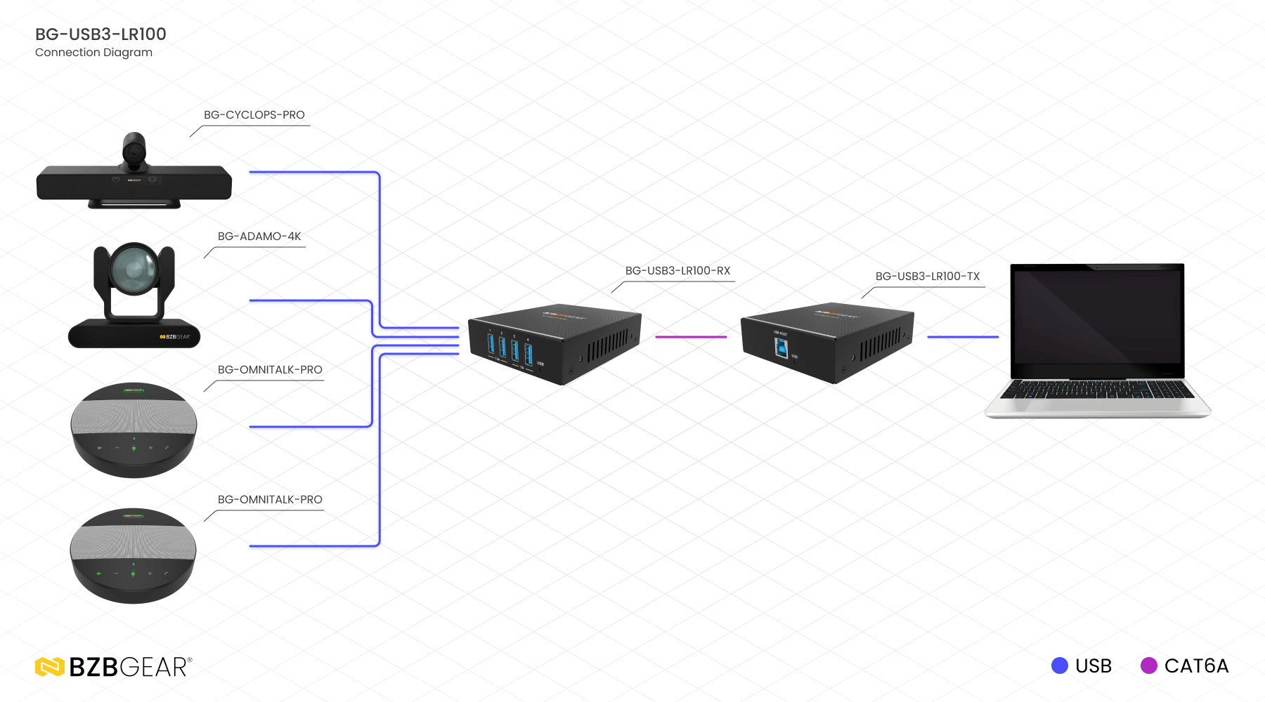 Receiver | Input: 1 × HDBT IN [RJ45, Female] Output: 4 × USB Devices [USB-A, 9pin Female] Control: 1 × RS-232 [3pin-3.5mm Phoenix Connector] 1 × FSYNC [1pin-3.5mm Phoenix Connector] 1 × SERVICE [USB-C, Update Port] |