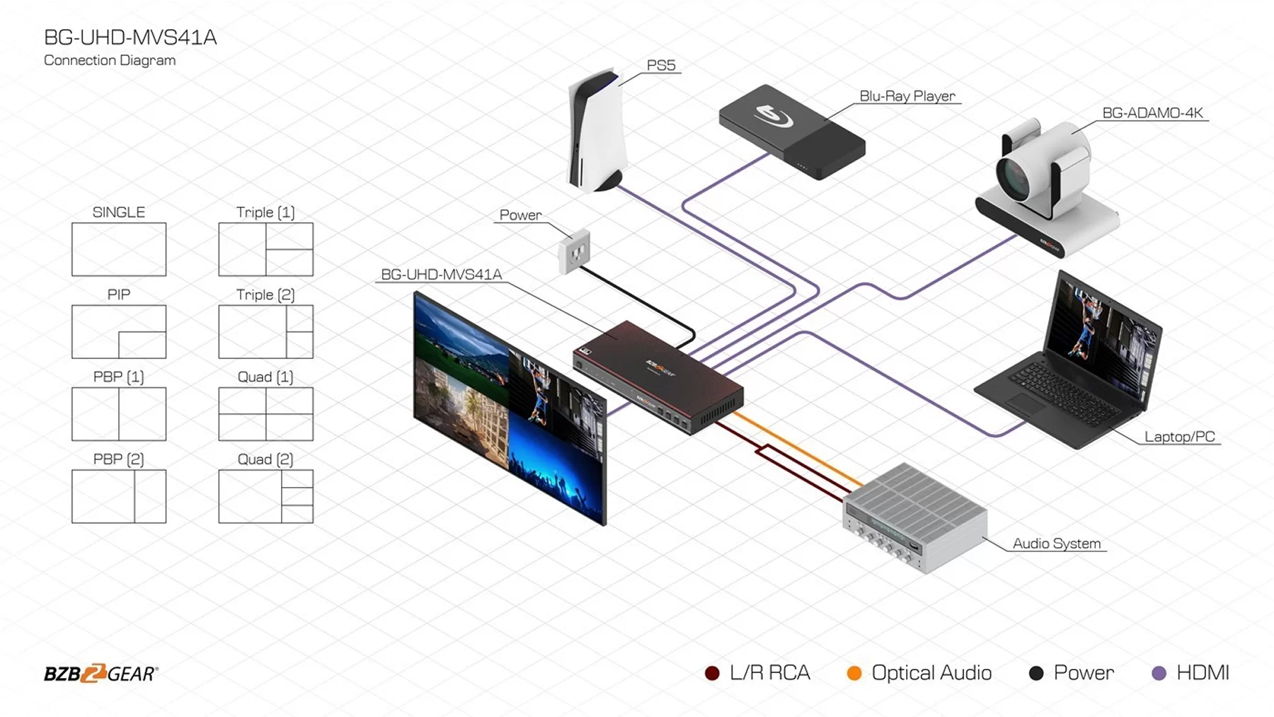 4x1 4K UHD HDMI Seamless Switcher/Scaler/MultiViewer with PIP/Audio De-Embedding and 8 Display Modes