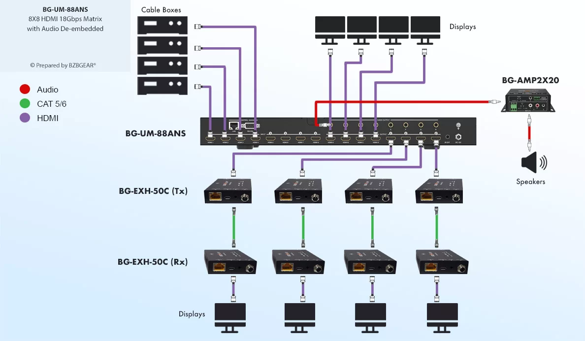 Install four BG-EXH-50C HDMI extenders by connecting the Transmitters to the Matrix Switcher’s HDMI outputs. Mount the Receivers behind the displays. Run CAT6 cabling to the displays from the AV equipment location. Connect the CAT6 cables to the Receivers and Transmitters. Connect the display using HDMI cables to the Receivers.