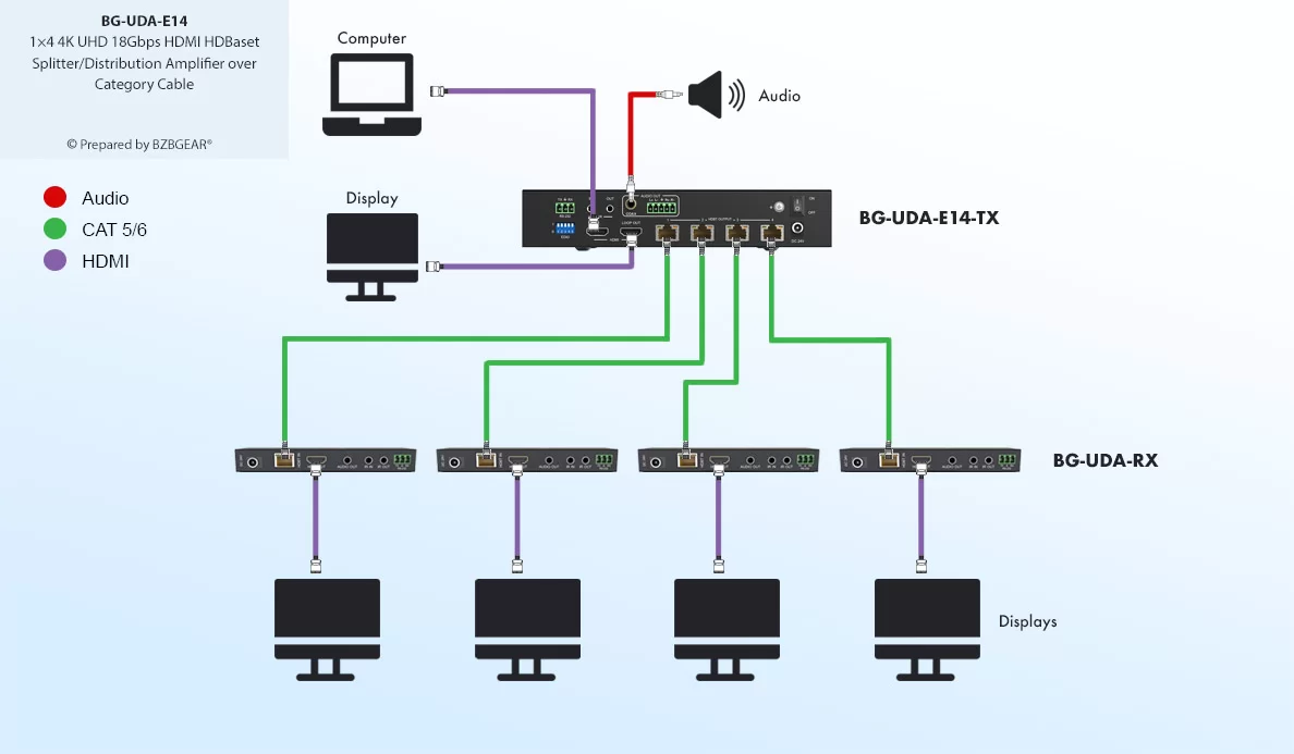 Since a standard Matrix Switch would require HDMI Extenders to reach these long distances over 50 ft, the best option is to install a BG-UDA-E14. This system integrates an HDBaseT transmitter within the main unit and provides four Receivers that will be located behind the displays.