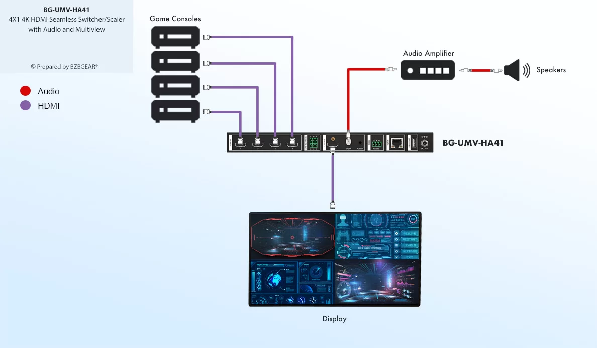 Back to Carlos’s best option, connecting the BG-UMV-HA41 is very simple. It only requires connecting the four gaming systems and one HDMI output to the display. After connecting the HDMI cabling and selecting the proper input on the TV, use the IR remote or front panel control to select between the layouts. For this application, Carlos will be selecting the 2x2 format layout. It’s that easy, just plug the unit's power in and entertain for hours!