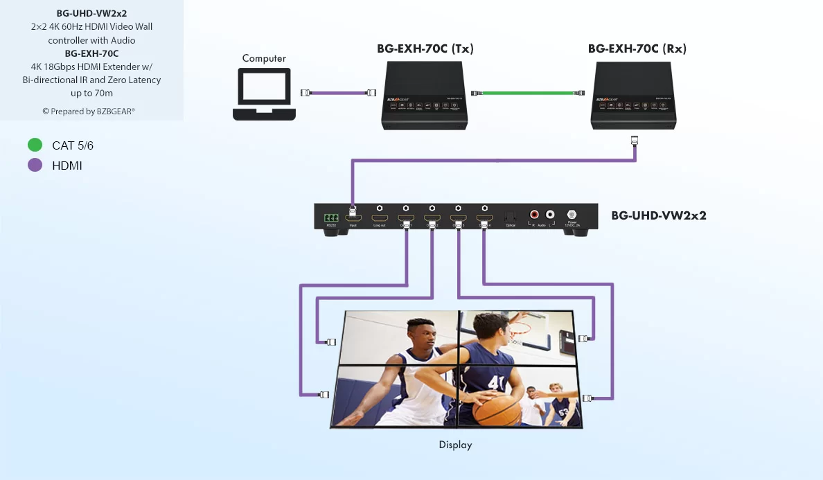 Mount the BG-UHD-VW2x2 behind the displays. Run a CAT6 cable from the computer location where the Live Streaming program resides. Connect an HDMI cable to the Transmitter, then plug in the CAT6 cable for video, audio, and power to the same unit. Connect the TVs to the Receiver unit using HDMI cables. Plug in power and the CAT6 cable from the Transmitter to the Receiver’s RJ45 port. Power up all devices including the source computer. Use the IR remote to change the layout to 2x2 and use the preconfigured presets for bezel adjustment to properly fit the image in the area. Stand back and marvel at stunning imagery, especially when using BZBGEAR PTZ cameras providing live broadcasting superiority.