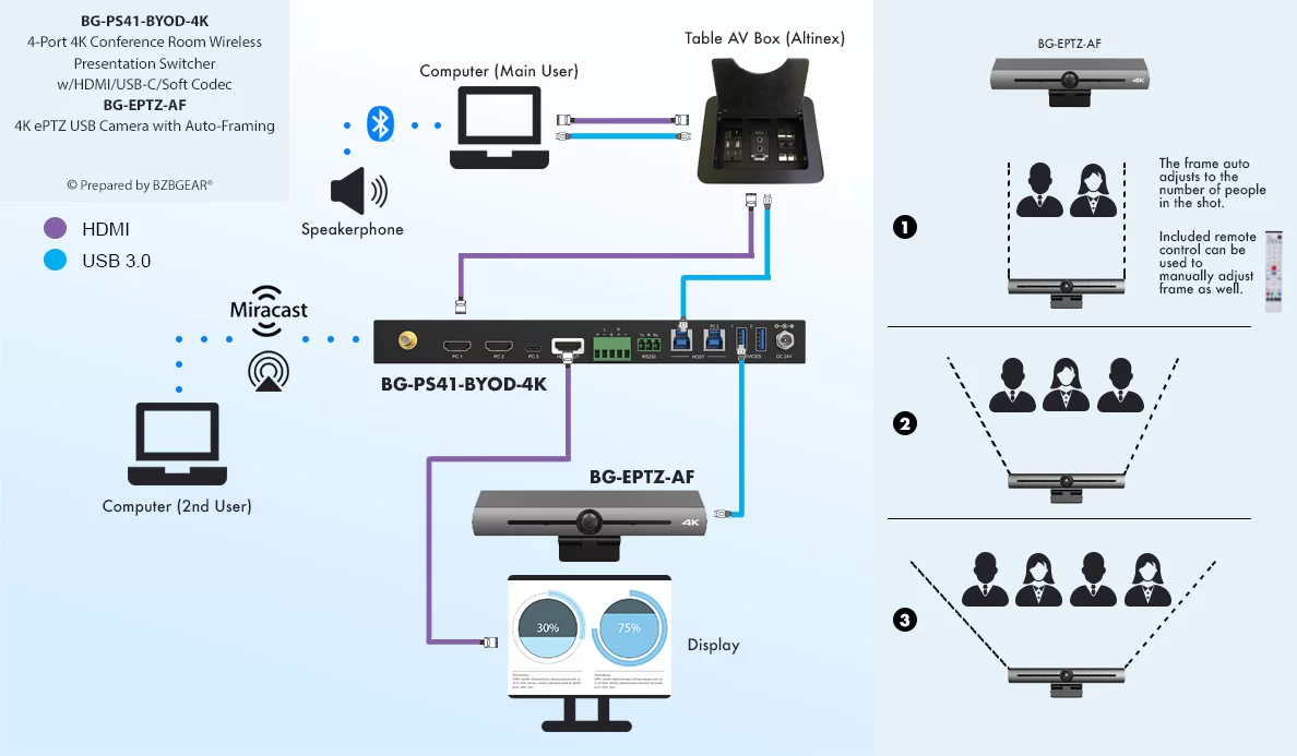 The BG-PS41-BYOD-4K Wireless Switcher connects Macs, PCs, phones, and iPads for sharing information on the display, engaging the room and prospective clients. When combined with the BG-EPTZ-AF Auto Framing Conference Camera, the communication and ease of connections greatly assists in presenting and conferencing.
